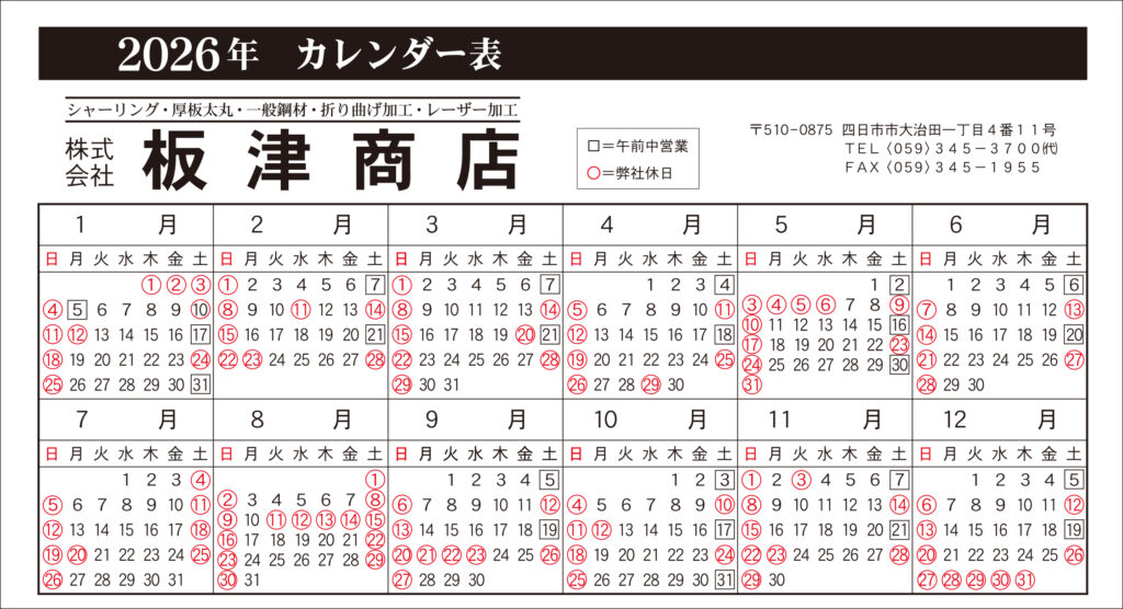 2026年営業日カレンダー
